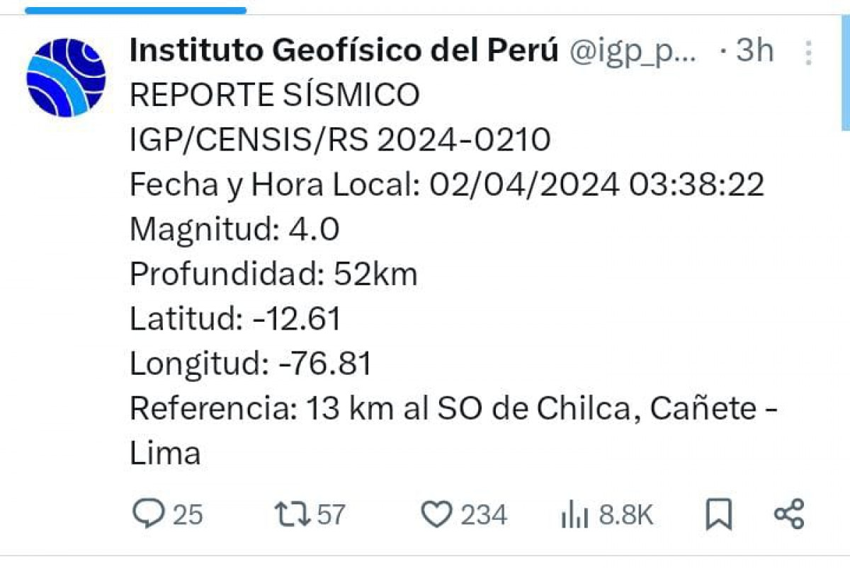 Hoy, martes 02 de abril del 2024, se produjo una gran cantidad de sismos consecutivos en Perú, según la información recopilada por el Instituto Geofísico del Perú (IGP) a través de su cuenta oficial de Twitter, ahora conocida como X. La entidad recomienda a la población tomar todas las medidas necesarias para evacuar y sobre todo proteger a las personas más vulnerables.
