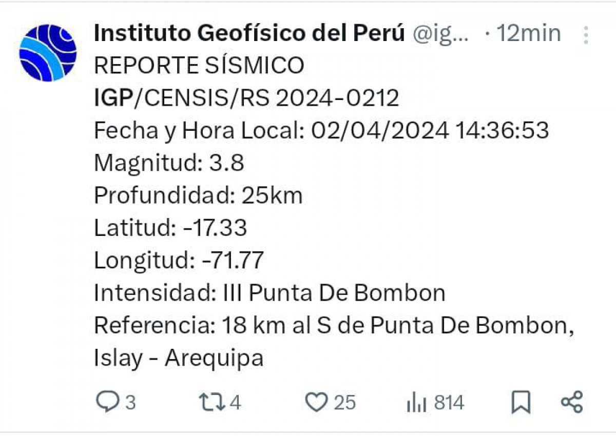 Sismo en Arequipa de 3.8