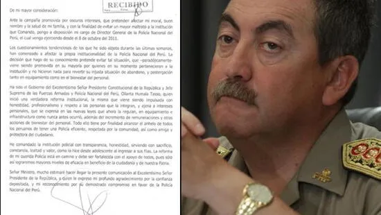 Raúl Salazar, General de la Policía Nacional del Perú, presentó anoche su carta de renuncia al Ministro del Interior Wilfredo Pedraza, luego de la ola de críticas recibida tras los últimos acontecimientos delincuenciales que pusieron en vilo al país.Entre otros motivos, la misiva, que fue enviada a los medios de comunicación, Salazar destaca que su dimisión tiene por finalidad evitar mayores daños a la imagen de la Policía y la salud de su familia.Asimismo, Raúl Salazar responsibiliza de una campaña en su contra a "quienes en su momento pertenecieron a la institución y no hicieron nada para revertir su injusta situación de abandono".Finalmente, resalta que su labor fue "con sacrificio, constancia, lealtad y valor, como lo hice desde adolescente al ingresar a sus filas", y que la reforma debe ser un trabajo en conjunto de la ciudadanía y el gobierno, en el cual destacó el papel del presidente Ollanta Humala y agradeció su confianza al nombrarlo en el cargo.Lea la carta completa:Ante la campaña promovida por oscuros intereses, que pretenden afectar mi moral, buen nombre y la salud de mi familia, y con la finalidad de evitar un mayor maltrato a la institución que comando, pongo a disposición mi cargo de Director General de la Policía Nacional del Perú, el cual vengo ejerciendo desde el 8 de octubre del 2011.Los cuestionamientos tendenciosos de los que he sido objeto durante las últimas semanas, han comenzado a afectar la propia institucionalidad de la PNP. La decisión que hago de su conocimiento pretende evitar tal situación, que —paradójicamente— viene siendo promovida en su mayoría por quienes en su momento pertenecieron a la institución y no hicieron nada para revertir su injusta situación de abandono, y postergación tanto en equipamiento como en el bienestar del personal.Ha sido el Gobierno del Excelentísimo Señor Presidente Constitucional de la República y Jefe Supremo de las Fuerzas Armadas y Policía Nacional del Perú, Ollanta Humala Tasso, quien inició una verdadera reforma institucional, la misma que viene siendo impulsada con honestidad, profesionalismo y respeto a las personas que la integran y ajena a intereses personales, que se expresa en las nuevas leyes que ahora la regulan, en equipamiento e infraestructura como nunca antes ocurrió, además del incremento de remuneraciones y otras acciones de bienestar personal. Todo ello tiene por finalidad alcanzar el anhelo de todos los peruanos de tener una Policía eficiente, respetada por la comunidad, así como amiga y protectora del ciudadano.He comandado la institución policial con transparencia, honestidad, sirviendo con sacrificio, constancia, lealtad y valor, como lo hice desde adolescente al ingresar a sus filas. La reforma de mi querida Policía está en camino y debe ser fortalecida con el apoyo de todos, pues sólo así lograremos mayores niveles de eficacia en beneficio de la ciudadanía y de nuestra Patria.Señor Ministro, mucho estimaré hacer llegar la presente comunicación al Excelentísimo Señor Presidente de la República, a quien le expreso mi profundo agradecimiento por la confianza depositada y mi reconocimiento por su demostrado compromiso en favor de la Policía Nacional del Perú.
