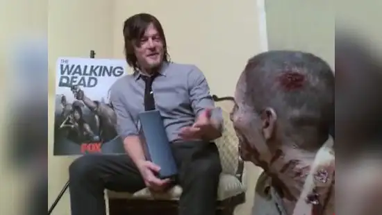 A tan solo tres semanas de estrenarse la nueva temporada de la exitosa serie de zombies "The Walking Dead", su protagonista Norman Reedus, quien en la historia da vida al personaje de Daryl Dixon, se llevó el susto de su vida al tener un encuentro cercano con un zombie "real".La broma, que es todo un éxito en la plataforma de videos de YouTube, fue elaborada por Nick Santonastasso, un hombre que nació sin piernas y con un solo brazo, y que se ofreció para hacer la broma a Reedus.Pero Nick no lo hizo solo, pues como su cómplice tuvo nada más y nada menos que a Andrew Lincoln, quien en la serie da vida al héroe Rick Grimes. El actor supervisó los trabajos de maquillaje con Santonatasso y hasta le dio algunos tips para la broma.Es así que Norman Reedus acude tranquilamente a dar unas palabras para invitar a los fans de "The Walking Dead" a disfrutar del primer capítulo de la nueva temporada, sin imaginar lo que estaba por sucederle.Nick se había ocultado bajo el mantel de una mesa esperando el momento más oportuno para sorprender a Norman quien al ver salir al "zombie real" pegó tremendo grito que hizo reir a Andrew Lincoln y los miembros del equipo de producción.Ya pasado el momento y un poco más calmado, "Daryl Dixon" soltó unas risas y abrazó a Nick además de felicitarlo por la performance. Acto final, Andrew y los miembros del staff salieron al encuentro de su compañero y a contarle cómo elaboraron la broma.El video forma parte de la estrategia publicitaria que la cadena Fox, está emitiendo a través de su señal de cable para promocionar el estreno de la nueva temporada de "The Walkign Dead" programada para este 9 de febrero.