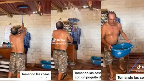 Señor trata de botar el agua de su techo de calamina tras las fuertes lluvias y le sale mal