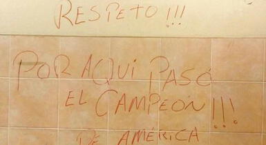 El mensaje seria una copia del escrito por la selección brasileña tras su paso por Santiago, cuando los campeones del mundo se sintieron menospreciados por los chilenos. “Más respeto para los campeones” pintaron los garotos. Esta publicación deja aclarada que el miembro de la `Roja´ ni siquiera fue original al escribir el mensaje.