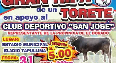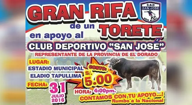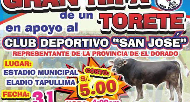 San Martìn. Conforme los equipos van avanzando en la Copa Perú tienen mayores gastos. Por eso el San José de Agua Blanca (El Dorado) que ha logrado clasificar como uno de los seis equipos a la siguiente etapa de la Departamental de San Martín no encontró mejor manera de alcanzar dinero y realizará una rifa de un torete.