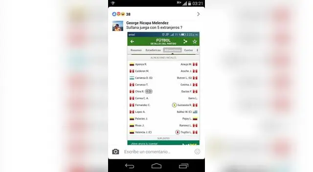 Presentó la lista de jugadores titulares de los churres a los colombianos Jhon Jairo Valencia, Jamillacson Palacios, Robinson Aponzá, Janeiler Rivas y al argentino (con su respectiva bandera) Diego Carranza, pero lo que desconocía el cibernauta era que el portero es nacionalizado peruano y ya no ocupa la plaza de extranjero.