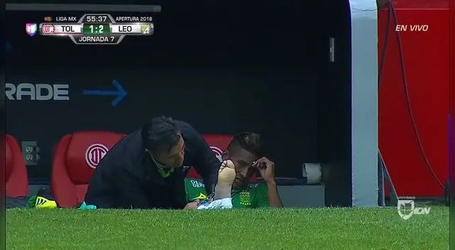 El volante peruano se fue de la cancha tras chocar con un jugador rival, regresó al terreno de juego tras ser evaluado por los médicos, sin embargo, no pudo seguir jugando más por el dolor en el pie derecho, por lo que fue reemplazado a los 55 minutos por Mejía.