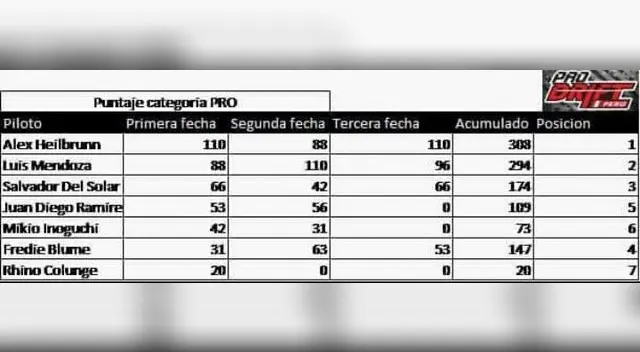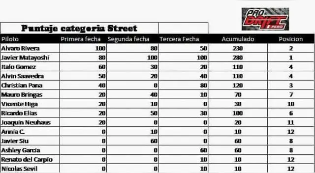 El piloto de Mitsui, Matayoshi se encuentra en el primer lugar tras haber ganado las tres primeras fechas alcanzando 280 puntos, dejando segundo a Álvaro Rivera (230 puntos) y tercer lugar lo empatan Italo Gómez y Alvin Saavedra con 110 puntos.