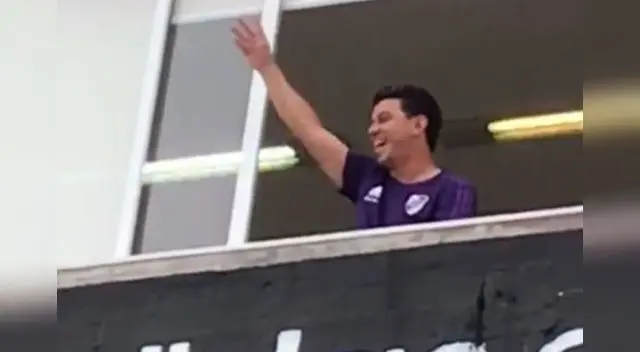 Una vez finalizado el partido que terminó empatado 2-2, el 'Muñeco' asomó por una las ventanas de la concentración de River levantando el brazo y celebró el empate con los hinchas que estaban en las afueras del estadio.