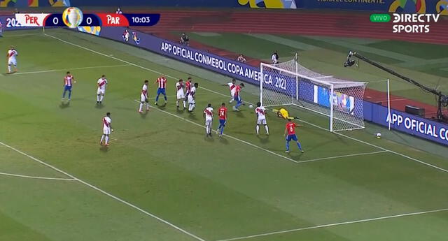 ¡Gooooool! Perú 0, Paraguay 1. Gustavo Gómez de la selección de Paraguay remate con la derecha desde muy cerca por bajo, junto al palo izquierdo tras un saque de esquina.