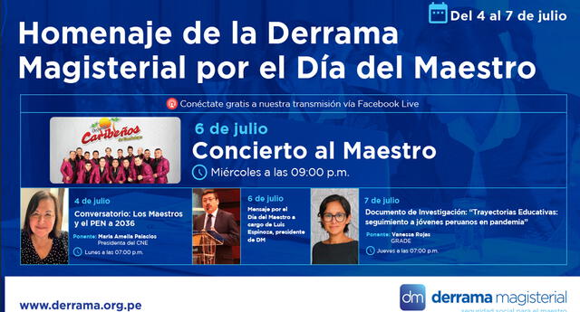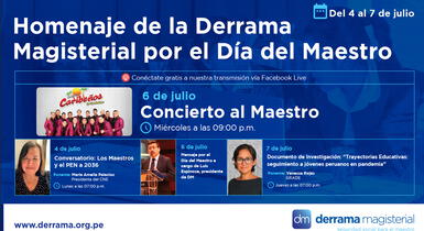 Del 4 al 7 de julio, Derrama Magisterial homenajeará a los maestros y maestras del país con una serie de charlas y eventos culturales. Los maestros y maestras que deseen conectarse a los conversatorios y al evento online, podrán hacerlo ingresando al Facebook de Derrama Magisterial, previa inscripción.