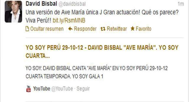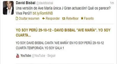 El popular cantante español David Bisbal elogió, vía Twitter, a su imitador peruano en el reality musical 'Yo Soy'."Una versión de Ave María única J Gran actuación! Qué os parece? Viva Perú!!", señaló en referencia a Aldo Riccio, su imitador.Aldo participa en la cuarta temporada del programa de imitación. Hoy cantará para seguir en carrera, tras quedar sentenciado el pasado lunes.