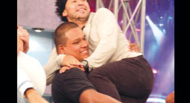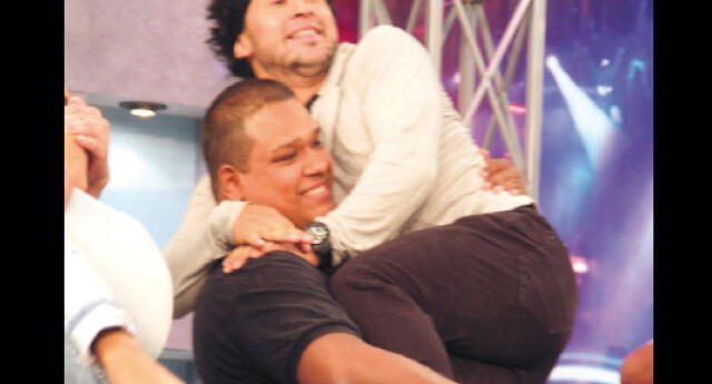 Zumba se aferra con fuerza a un fortachón que lo tiene bien cargado. El inquieto muchachón del reality Combate parece tener miedo a algo o alguien y le pide a su amigote que no lo baje. Saooooooooooo...