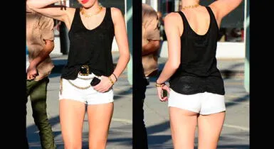 La cantanteMiley Cyrusdejó ver más que su esbelta anatomía durante un paseo por las calles de Bervely Hills. La joven artista llevaba puesto un polo negro, zapatos de tacón de rayas negras y plateado, y unshort blancoque dejaba ver su trasero, además de sus largar piernas.