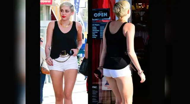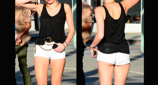 La cantante Miley Cyrus dejó ver más que su esbelta anatomía durante un paseo por las calles de Bervely Hills. La joven artista llevaba puesto un polo negro, zapatos de tacón de rayas negras y plateado, y un short blanco que dejaba ver su trasero, además de sus largar piernas.