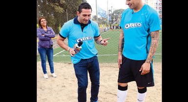 Paolo Guerrero mira disimuladamente al reportero Víctor Hugo Dávila, quien se mata bailando para demostrarle que es bravo moviendo la cintura.