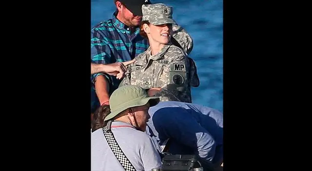 A pesar de las horas de filmación la chaqueta de gran tamaño de Kristen permaneció intacta, lo que demuestra que ella es la soldado más sexy desde el recordado personaje de GI Jane y su camiseta gris ajustada.
