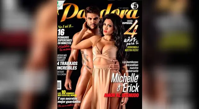 En esta imagen, diseñada para una revista local, Erick aparece sin nada de ropa, tal como vino al mundo, unos pícaros tatuajes se asoman por su muslo. Michelle lo agarra del pelo y de paso lo cubre con sus caderas.