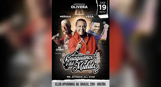 Los tres estarán juntos en una misma tarima, regalándonos lo mejor de su repertorio en la fiesta denominada El guagunco del mulato que se realizará este sábado 19 de noviembre, en el club Apurímac (Av. Brasil 289 - Breña). Estarán acompañados por la orquesta Mr. Afinque All Star.