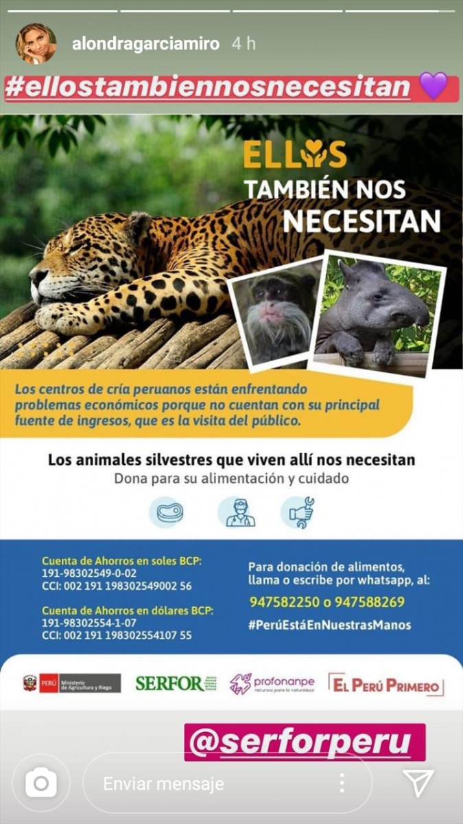"Ellos también nos necesitan. Los centros de cría peruanos están enfrentando problemas económicos porque no cuentan con su principal fuente de ingresos, que es la visita del público ... Los animales silvestres que viven ahí nos necesitan. Dona para su alimentación y cuidado ... Cuenta de ahorros BCP ... Para donación llama a 947582250 - 947588269", dictaba parte del post que compartió la ojiverde en sus redes sociales.