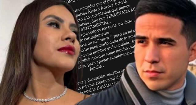 Tras defender que su carrera no avanzó por shows, lamento lo apenada que está por la actitud de Álvaro Aurora: "Con mucha tristeza y decepción, escribo este comunicado porque esto no solo me afecta a mí sino también a mi familia, familia que le abrió las puertas de mi casa y ni siquiera tuvo la gentileza de salir por la puerta grande agradeciendo a mi madre que lo quiso como a un hijo. (...) Nos quisimos mucho y no es justo que esto haya terminado de esa forma", agregó.