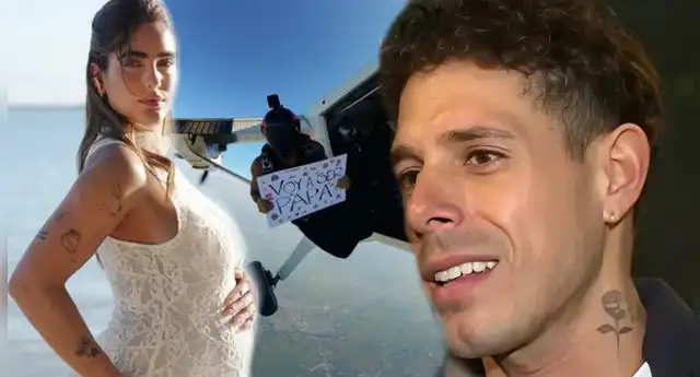 En las imágenes se observa a Hugo García lanzándose desde una avioneta mientras sostenía un cartel elaborado por él mismo con el mensaje: “Voy a ser papá”, acompañado de una ecografía de su bebé.