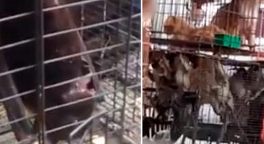 Las aves y los gatos, que también se comen en partes del país, se muestran en jaulas apretadas cubiertas de excremento y alimentos que parecen estar podridos. Un conejo aparentemente convulsionó y murió delante de la cámara del investigador de PETA.