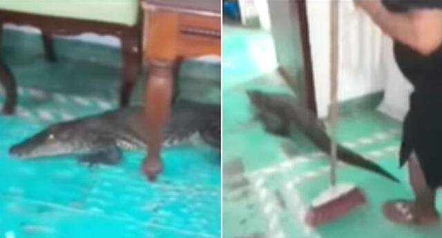 Cocodrilo entra a una casa, pero señora lo bota a 'escobazos' de forma peculiar y es viral: "Mi nene hermoso" [VIDEO]