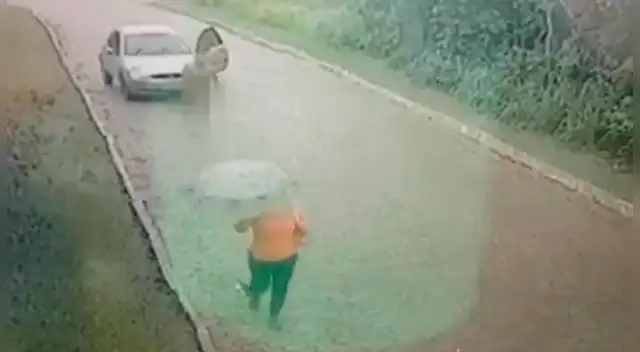 Las imágenes registraron el instante en que la mujer caminaba tranquilamente bajo la lluvia en Buzios, un balneario en las regiones lacustres de Río de Janeiro. Sin sospechar que en el camino sería interceptada por un carro, que de su interior salió un hombre completamente desnudo para acecharla.