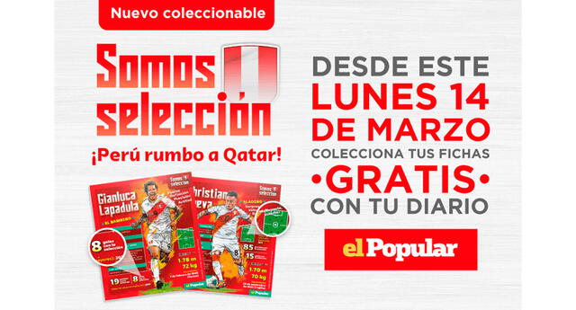 ¡Arriba Perú! Desde el lunes 14 de marzo podrás encontrar GRATIS con el diario El Popular las fichas de los seleccionados rumbo a Qatar 2022.
