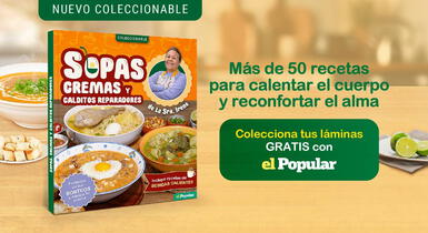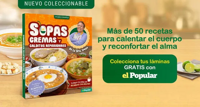 Este coleccionable tiene las mejores recetas para preparar en casa, con los secretos y consejos de la Sra. Irene Gamboa. Son más de 50 sopas caseras y regionales, cremas de verduras nutritivas y calditos reparadores que estarán disponibles desde este 15 de julio. Además, todos los domingos, habrá una sección especial de bebidas calientes que serán tus aliadas en los días más fríos del año. Recuerda reclamar en tu primera entrega la carpeta coleccionadora.