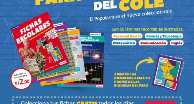 ¿Tus hijos tienen problemas para hacer las tareas del colegio? El Popular tiene la solución, pues presentará una nueva colección de fichas escolares, que ayudarán a mejorar su rendimiento, pues comprenden explicaciones llenas de ilustraciones con resúmenes de fácil comprensión para los estudiantes.