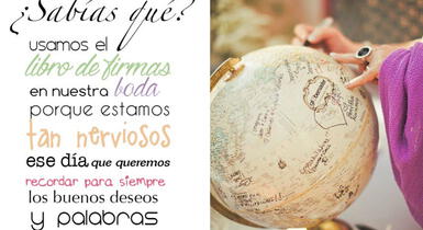 GLOBO TERRÁQUEO. Se trata de una idea muy original sobre todo para los novios amantes de viajar y conocer el mundo. Tus amigos firmarán sus mejores deseos alrededor de todo el globo terráqueo. Si te gusta esta idea, coloca un par de estos con rotuladores acompañado de flores o maletas vintage para decorar.