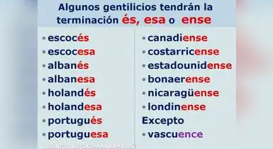Los gentilicios se forman añadiendo sufijos a los nombres de países, regiones y localidades. Los más empleados son: -eño, -eña, -ano, -ana, -ense, -és, -esa, -ino e -ina.