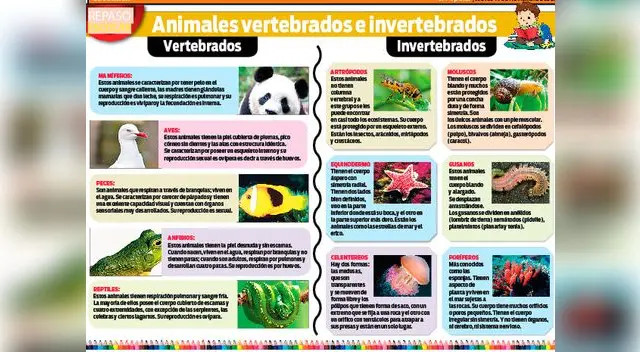 VERTEBRADOSMAMÍFEROS:Estos animales se caracterizan por tener pelo en el cuerpo y sangre caliente, las madres tienen glándulas mamarias que dan leche, su respiración es pulmonar y su reproducción es vivíparo y la fecundación es interna.AVES:Estos animales tienen la piel cubierta de plumas, pico córneo sin dientes y las alas con estructura idéntica. Se caracterizan por poseer un esqueleto interno y su reproducción sexual es ovípera es decir a través de huevos.PECES:Son animales que respiran a través de branquias; viven en el agua. Se caracterizan por carecer de párpados y tienen una excelente capacidad visual y cuentan con órganos sensoriales muy desarrollados. Su reproducción es sexual.ANFIBIOS:Estos animales tienen la piel desnuda y sin escamas. Cuando nacen, viven en el agua, respiran por branquias y no tienen patas; cuando son adultos, respiran por pulmones y desarrollan cuatro patas. Su reproducción es por huevos.REPTILES:Estos animales tienen respiración pulmonar y sangre fría. La mayoría de ellos posee el cuerpo cubierto de escamas y cuatro extremidades, con excepción de las serpientes, las culebras y ciertos lagartos. Su reproducción es ovípara.INVERTEBRADOSARTRÓPODOS:Estos animales no tienen columna vertebral y a este grupo se les puede encontrar en casi todo los ecosistemas. Su cuerpo está protegido por un esqueleto externo. Están los insectos, arácnidos, miriápodos y crustáceos.MOLUSCOS:Tienen el cuerpo blando y muchos están protegidos por una concha dura y de forma simetría. Son los únicos animales con un pie muscular. Los moluscos se dividen en cefalópodos (pulpo), bivalvos (almeja), gasterópodos (caracol).EQUINODERMO:Tienen el cuerpo áspero con simetría radial. Tienen dos lados bien definidos, uno en la parte inferior donde está su boca, y el otro en la parte superior más duro. Están los animales como las estrellas de mar y el erizo.CELENTEREOS:Hay dos formas: las medusas, que son transparentes y se mueven de forma libre y los pólipos que tienen forma de saco, con un extremo que se fija a una roca y el otro con un orifico con tentáculos para atrapar a sus presas y están en un solo lugar.GUSANOS:Estos animales tenen el cuerpo blando y alargado. Se desplazan arrastrándose. Los gusanos se dividen en anélidos (lombriz de tierra) nemátodos (pidulle), platelmintos (planaria y tenia).PORÍFEROS:Más conocidos como las esponjas. Tienen aspecto de planta y viven en el mar sujetas a las rocas. Su cuerpo tiene muchos orificios o poros pequeños. Tienen el cuerpo irregular sin simetría. Y no tienen órganos, ni cerebro, ni sistema nervioso.