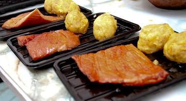 Pela y corta el plátano verde en rectángulos y fríelos en aceite. Retira y reserva en papel absorbente y machácalos con un mazo. Agrégale los otros plátanos y muele todo. Aparte corta el chicharrón de cerdo en trozos, fríelos con la manteca y agregalos al plátano molido. Tras integrar bien los alimentos, forma con las manos bolas medianas y mételas al horno por cinco minutos a 160 grados. En una sartén fríe la cecina. Sirve dos o tres bolas con un triángulo de cecina.