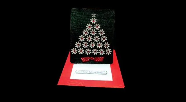 Una vez que tengas los materiales listos, sigue los pasos del costado. El datoCada vez que jales la cinta de organza colocada en la cartulina interna se moverá el árbol hacia arriba y se podrá leer el mensaje navideño que quieras.Termina:Corta otra cartulina y pégale 21 flores cortadas con perforador armando un arbolito. Decora con cinta y pega toda la pieza en la parte inferior del recuadro interno. Así cuando jales se levantará.