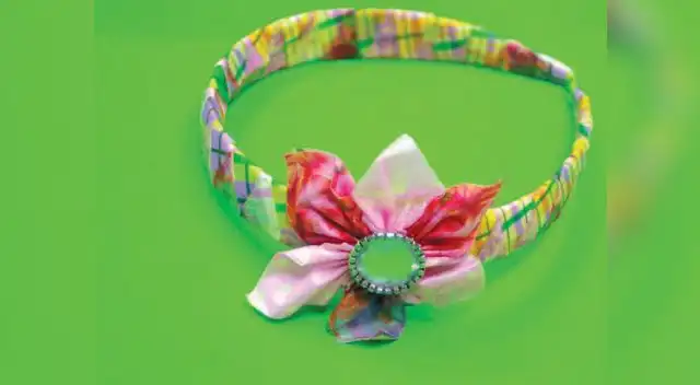 Aplica servitel sobre una servilleta, deja secar y corta dos tiras de 1cm. Une cada tira formando una “L” sobre la parte interna de la vincha y teje cruzando una tira con la otra alrededor de toda la vincha. Para hacer la flor, corta seis cuadrados de servilleta, dobla en forma triangular e hilvana. Pega una gema como centro de la flor.