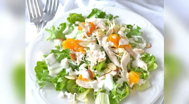 Pica dos manzanas, dos tazas de apio, un trozo de piña, durazno en cuadraditos, pimentón y mézclalos con dos tazas de uva y 1/2 taza de pecanas. En un bol aparte mezcla el juego de un limón con ½ litro de yogur natural y vierte este aliño sobre la ensalada. Cómelo al instante.