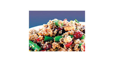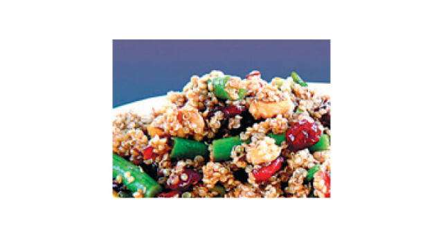Haz un aderezo con cebolla, ajo, ají panca, pimienta y tomate. Agrega la quinua sancochada, las papas en trozos, y remueve. Retira del fuego y echa el queso picado. Baña las anchovetas con jugo de limón, sal y pimienta, pásalas por harina y pan rallado. Fríelas. Sirve la quinua con la anchoveta frita, arvejas y culantro.