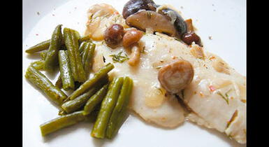 Prepara el arroz. Sancocha la papa, corta y dora. Condimenta el pescado; pasa por maicena y fríe. Corta en láminas los champiñones y saltea en aceite.