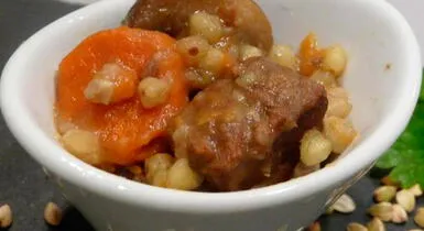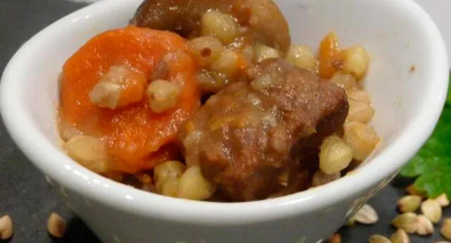 Incorpora la carne y dórala por unos minutos. Adiciona el líquido de cocción del trigo, la papa picada en cuadraditos, arvejas y cocina 30 min. Al final, añade el trigo sancochado y muévelo. Acompáñalo con arroz.