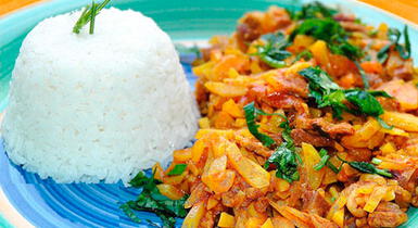 Verifica la sal y sirve acompañado de arroz graneado y papas sancochadas en rodajas.