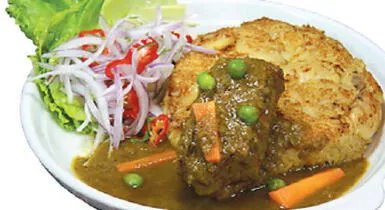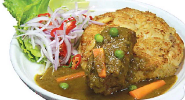 Ingredientes1 1 1/4 taza de arroz.1 3/4 taza de arveja seca.1 3/4 kilo de costillas de cerdo.1 1/4 taza de leche evaporada.1 1 /2 taza de aceite.1 1 cda de ají amarillo y 2 cebollas.1 1 ají amarillo y 1 tomate.1 Ajo, pimienta, limón y sal.PreparaciónPrepara el arroz. Dora los ajos, adiciona el arroz y cocina por 30 minutos. Sancocha las arvejas secas hasta que estén suaves. Fríe la cebolla, ajos, ají amarillo, pimienta, comino e incorpora las 3/4 de las arvejas, dale un hervor y agrega la leche, sal y bate. Mezcla las arvejas y une con el arroz. Separa en 4 porciones y fríe uno por uno hasta dorar. Condimenta las costillas de cerdo con ají amarillo, limón y sal. Sirve.