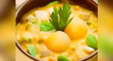 Sirve el ajiaco de habas frescas acompañado de arroz graneado, y huevo frito.