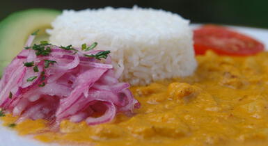 Ingredientes1 1 y 1/2 taza de arroz.1 400 gr de mondongo.1 1 limón y 1 cebolla.1 1 tomate y 1 pimiento.1 1/8 taza de aceite.1 1/4 de maní molido.1 1/2 taza de leche.1 4 unidades de papa.1 Sal, ajos y pimienta al gusto.1 Una rama de hierbabuena.PreparaciónLava el mondongo con agua, sal y limón, déjalo reposar por diez minutos, luego lava otra vez y repite el proceso. En una olla pon el mondongo (lavado en cuatro tazas de agua) con hierbabuena, ajos, sal y cocina.Una vez cocido, pica en pedacitos. Haz el sofrito: dora la cebolla, ajo, pimiento y tomate. Adiciona el maní, mondongo, papas y deja hervir. Agrega la leche, dale un hervor y sirve.