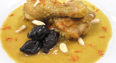 INGREDIENTES1 pollo cortado en presas.1 cda. colmada de mantequilla.1/2 cdta. de kion en polvo.1 cdta. de azafrán.1 rama de canela.1 cebolla, sal y pimienta.300 gr de ciruelas pasas (guindones).1 cdta. de canela en polvo.3 cdas. de miel.1 taza de caldo de pollo.