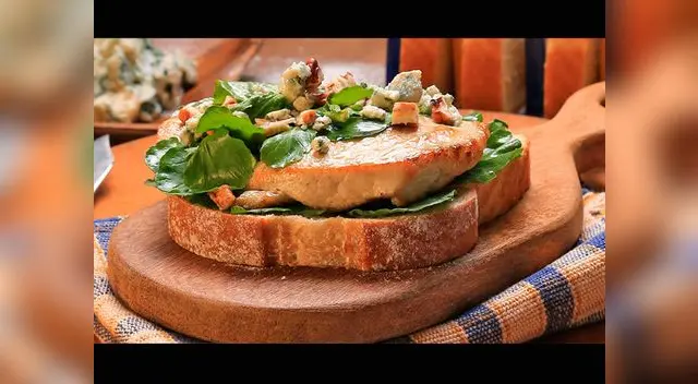 Preparación: Cortar la pechuga de pollo en filete, salpimentar y dorar en una sartén con un chorrito de aceite de oliva extra virgen o una pizca de aceite de coco. Colocar la pechuga sobre la rebanada de pan. Cubrir con las hojas de arúgula; y espolvorear el queso azul y las pecanas.
