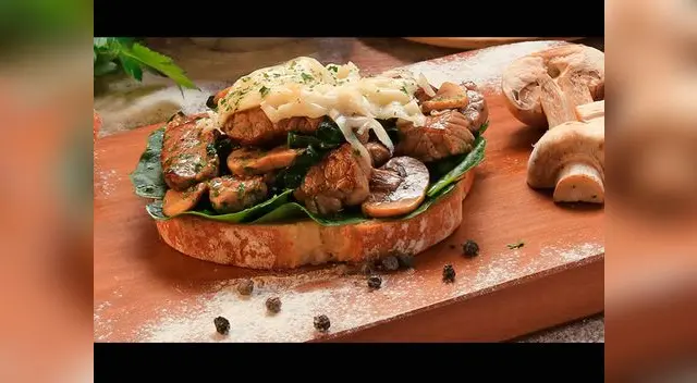 Preparación: Cortar el lomo fino en tiritas delgadas y dorar en una sartén antiadherente con una cucharada de aceite de oliva, sal y pimienta. En la misma sartén, saltear los champiñones y espinacas con el aceite restante, sal y pimienta. Combinar el lomo con los vegetales. Acomodar las hojas de espinaca y el saltado de lomo sobre la rebanada de pan. Espolvorear con el queso mozzarella y llevar al horno a gratinar; espolvorear con el perejil y servir de inmediato.