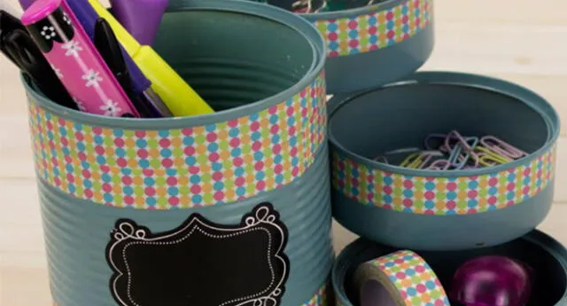 Accesorio es ideal para decorar tu oficina o cocina. Solo necesitas latas de diferentes tamaños, pintura en spray, cintas con diseño y silicona.