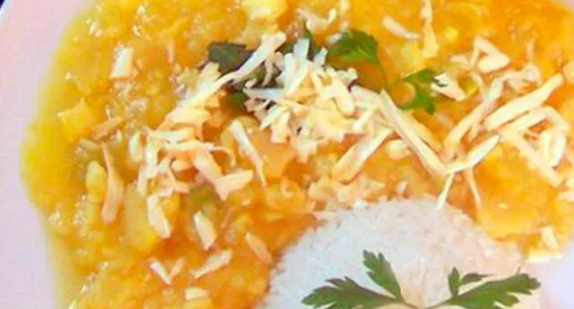 Ingredientes1 1 y 1/2 taza de arroz.1 1/2 kg. de calabaza.1 1/2 taza de habas frescas.1 1/2 taza de leche evaporada.1 1/2 taza de queso fresco.1 4 huevos.1 1/2 kg. de papa amarilla.1 3 cdas. de ají amarillo.1 1 cebolla mediana.1 Aceite vegetal, ajos y sal.PreparaciónGranea arroz, sancocha la papa amarilla y fríe los huevos. Dora en aceite la cebolla en cuadritos, ajos, ají amarillo, pimienta y sal.Agrega la calabaza picada sin pepas, habas frescas y una taza de agua. Deja cocinar entre 10 y 15 minutos.Luego añade leche y queso. Sirve con arroz, papas amarillas y huevo frito. p