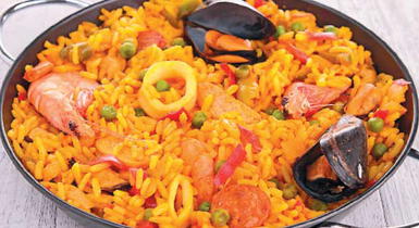 Pon el arroz a hervir con el curry, azafrán y sal. Tapa y cocina 50 minutos. Cuando hayan pasado 20 minutos agrega las presas de pollo, los trozos de cerdo, el chorizo español y el pimiento. Tapa y deja cocinar cinco minutos más. Añade las arvejas y el choclo. Después de 20 minutos suma los camarones y los mariscos. Tapa nuevamente y termina la preparación. Sirve de inmediato.Receta de Edith León, chef de Oster.
